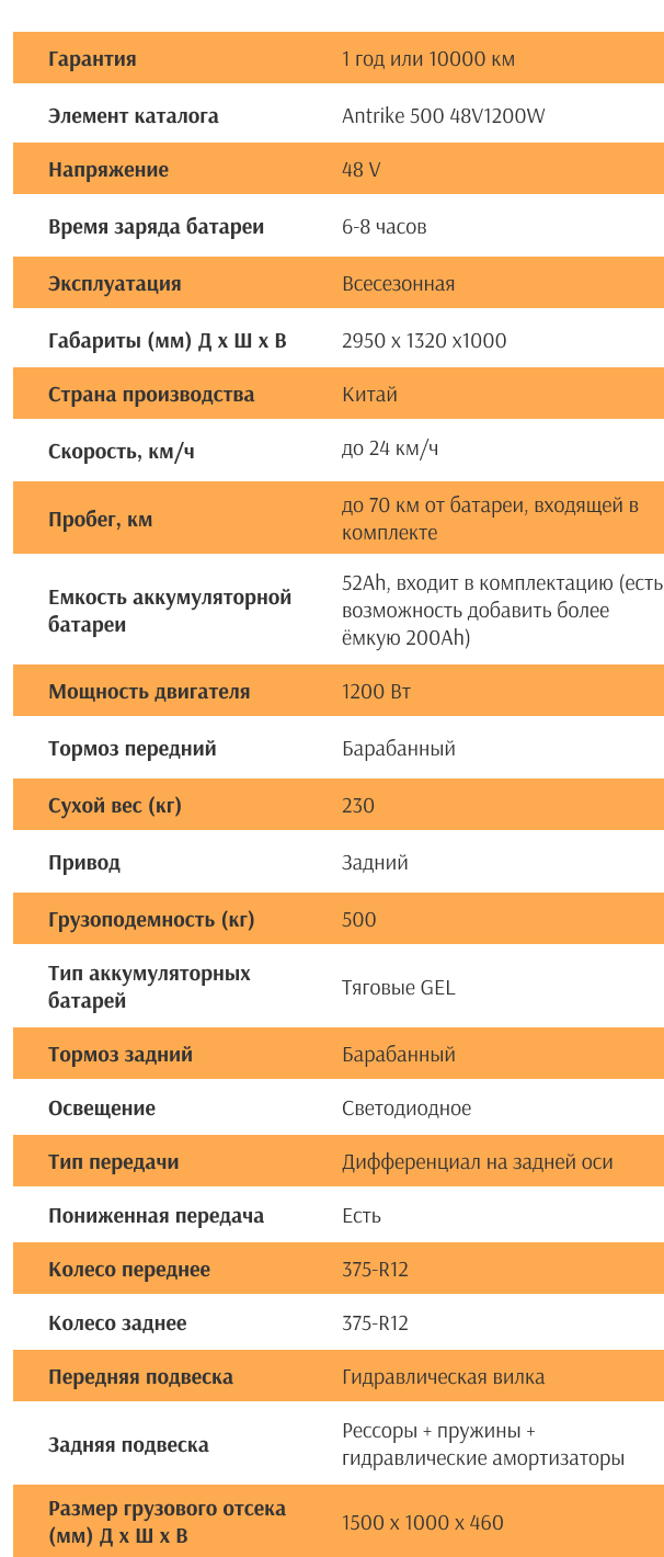 Трицикл удобен для транспортировки любых грузов общим весом до 500 килограмм. Благодаря свинцово-гелиевой батарее, трицикл можно использовать как в помещениях, так и на улице, в температурном диапазоне от -20 до +35 градусов по Цельсию.